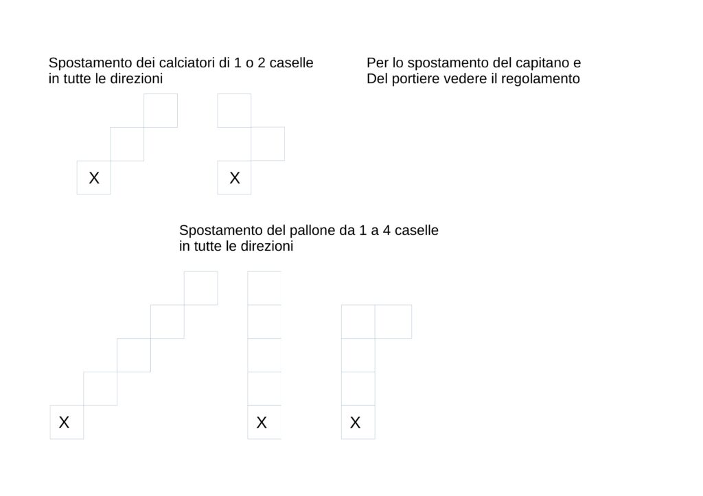 Il pallone per l’inizio partita va posizionato nella casella centrale cerchiata. Tassativo, ciascun giocatore si alterna nel turno della mossa.